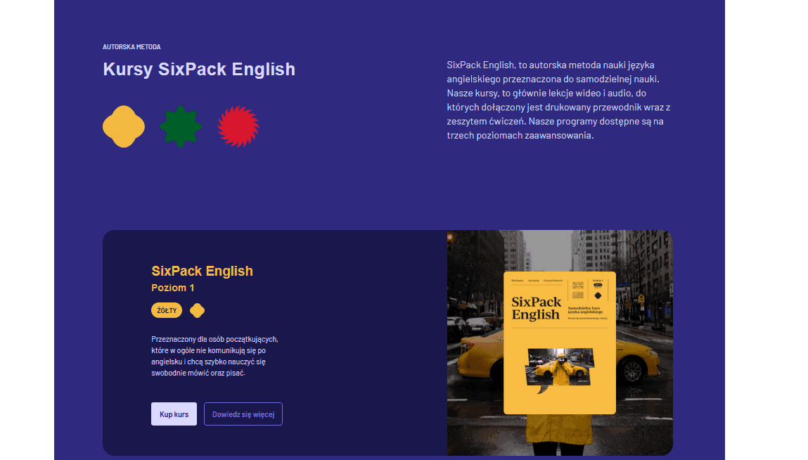 SixPack English: Autorska metoda nauki języka angielskiego przeznaczona do samodzielnej nauki. Nasze kursy, to głównie lekcje wideo i audio, do których dołączony jest drukowany przewodnik wraz z zeszytem ćwiczeń. Nasze programy dostępne są na trzech poziomach zaawansowania: Żółtym, Zielonym i Czerwonym. Kursy SixPack English są odpowiednie dla początkujących, średniozaawansowanych i zaawansowanych uczniów.